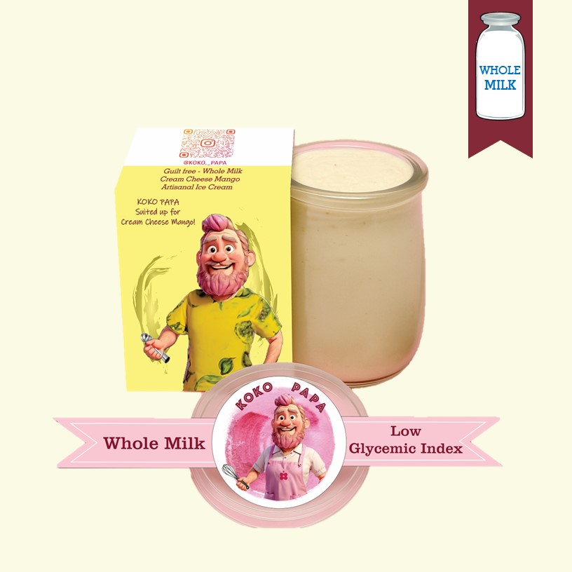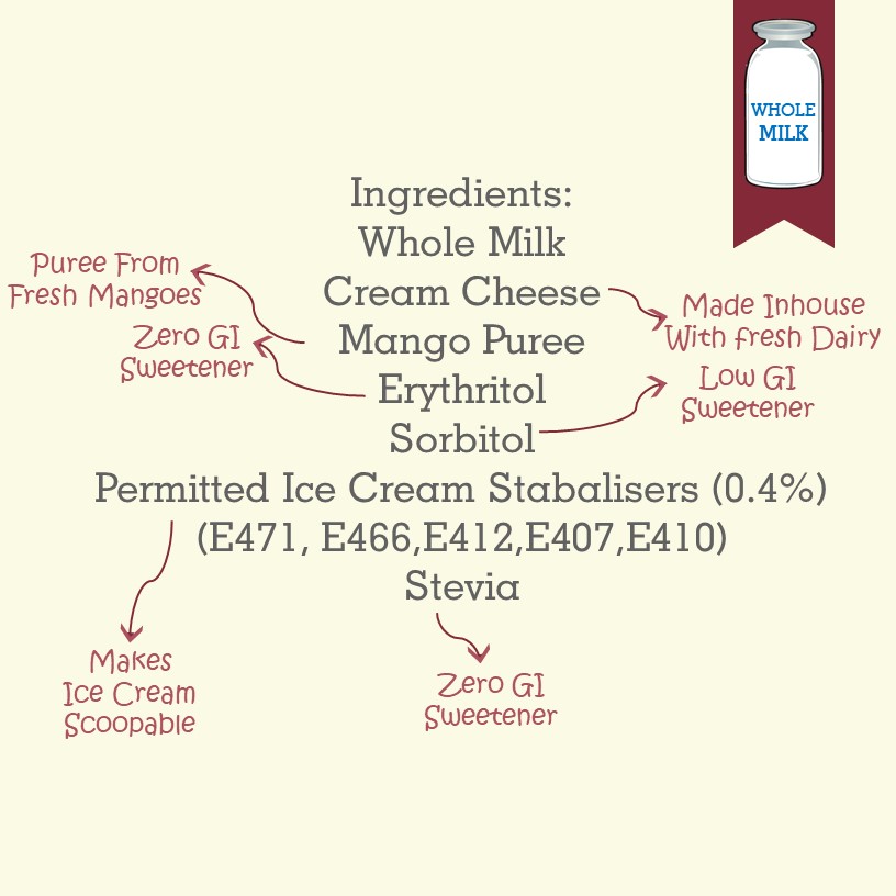Mango Puree from real fruits and Homemade traditional style cream cheese flavour this icecream made in Small Batches in the true artisanal manner. Sweetened with stevia and other Low GI sweeteners. A Decedant Guilt Free Naturally Flavoured Whole Milk Ice Cream.