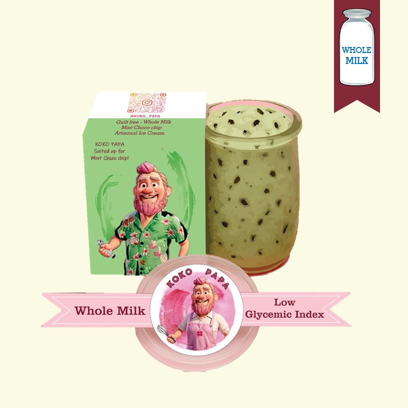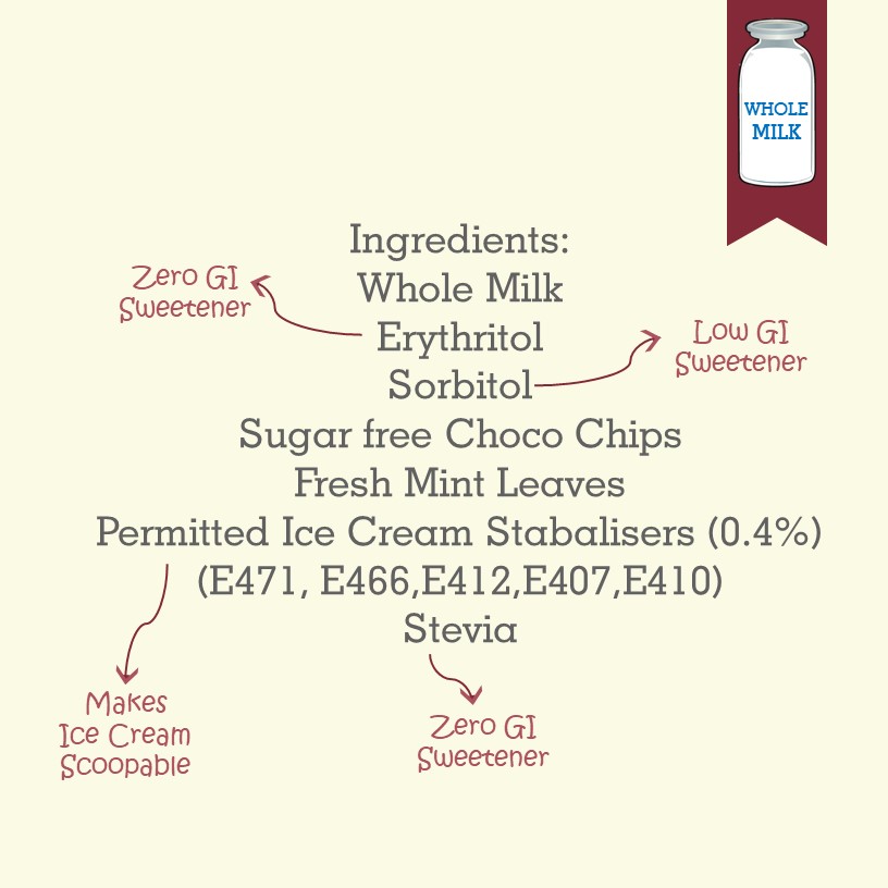 Fresh mint with chocolate chips is what flavours this Ice Cream, made in Small Batches in the true artisanal manner. Sweetened with stevia and other Low GI sweeteners. A Decedant Guilt Free Naturally Flavoured Whole Milk Ice Cream.